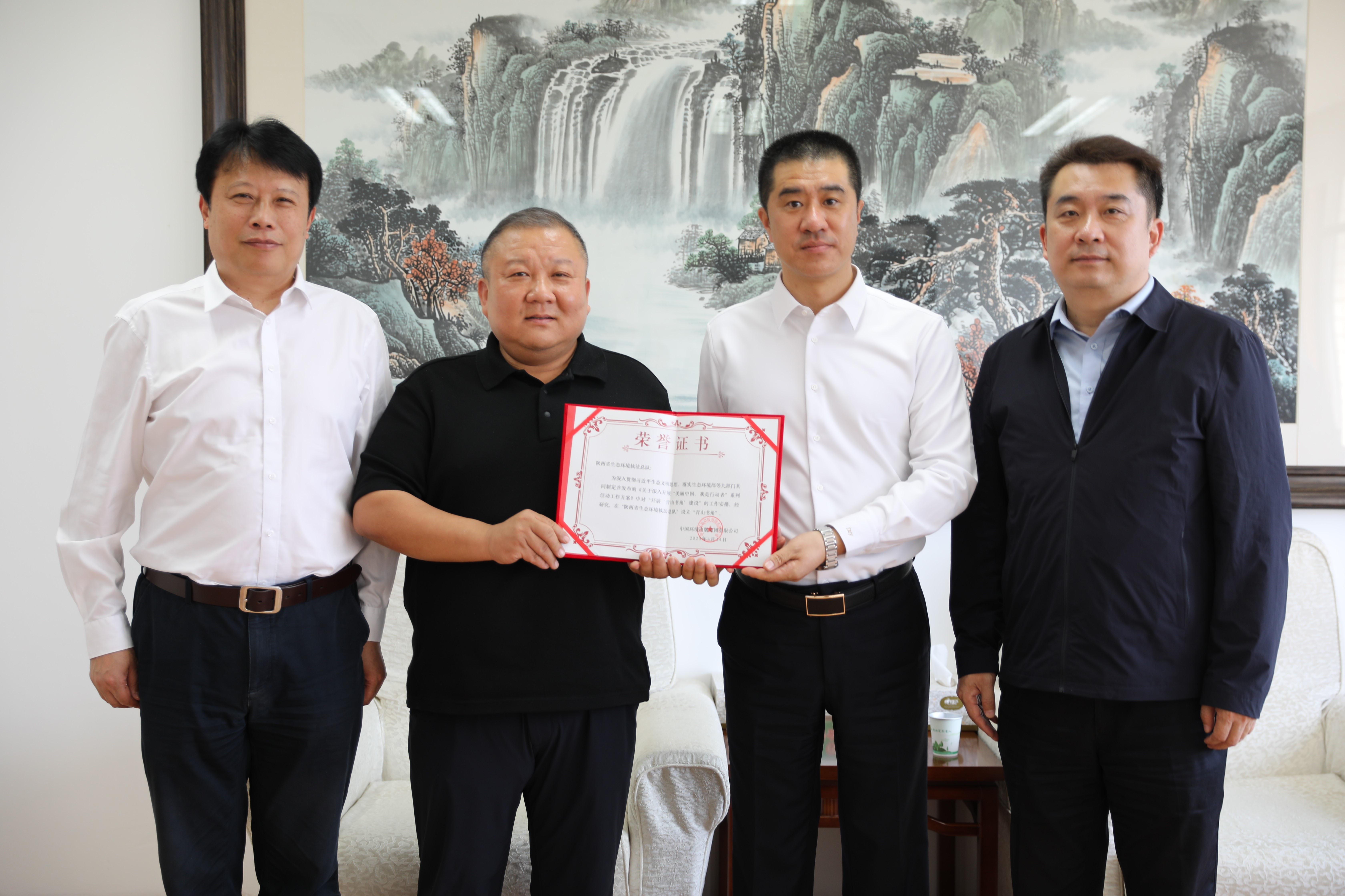 王付瑜對陜西省廳一直以來對出版集團建設發展的關心與大力支持表示感謝,介紹了出版集團圍繞生態環保中心開展圖書出版、期刊宣傳、版權輸出、“青山書角”建設等重點工作,為“青山書角”落戶陜西省生態環境執法總隊、銅川市生態環境局、西安市生態環境局高陵分局頒發證書。張金東介紹了陜西省生態環境保護工作、生態環境宣傳教育工作開展情況、取得的成效和今后的工作重點、發展方向,重點介紹了“當好小衛士、守護大秦嶺”等典型案例。雙方表示,深入貫徹習近平生態文明思想、習近平文化思想,全面落實生態環境保護大會精神,進一步高質量做好生態環保成果傳播與宣傳教育工作是雙方共同的目標,希望通過本次交流學習,共同為全面推進美麗陜西建設盡責盡力。